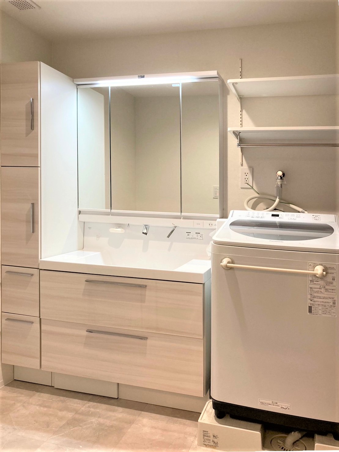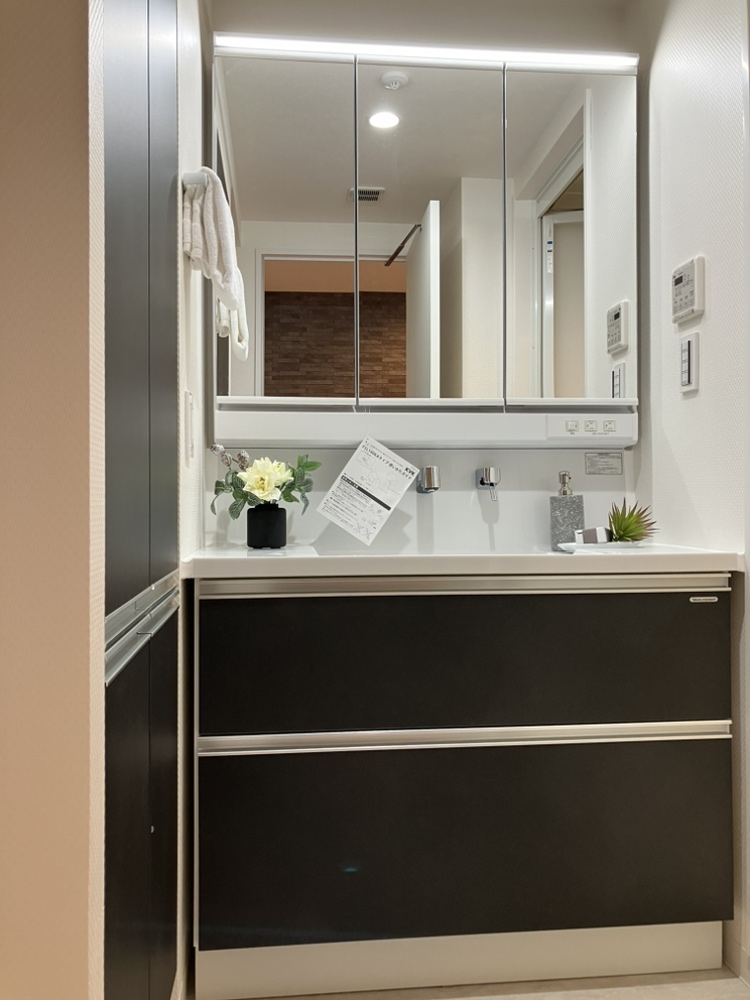 洗面台にトールキャビネットを組み合わせて、大容量の収納が実現。