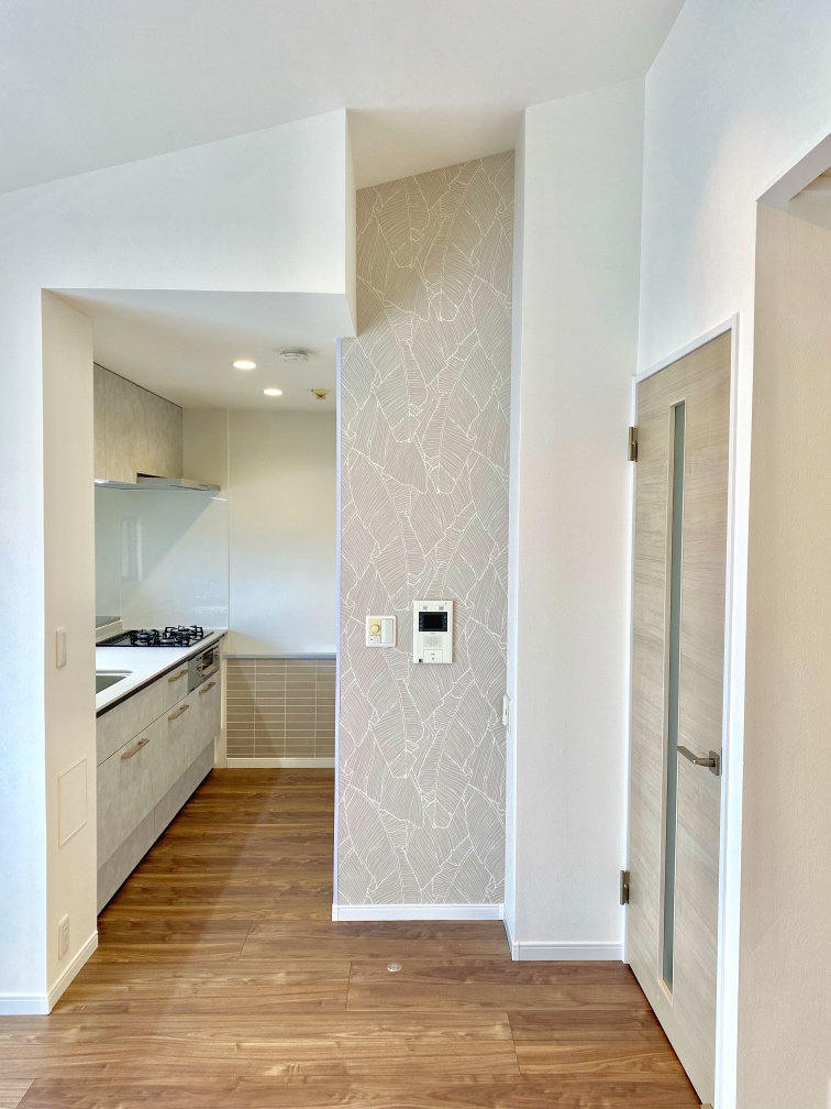 ボタニカル(植物)柄の壁紙や、腰壁風に張ったタイル柄の壁紙がアクセント。