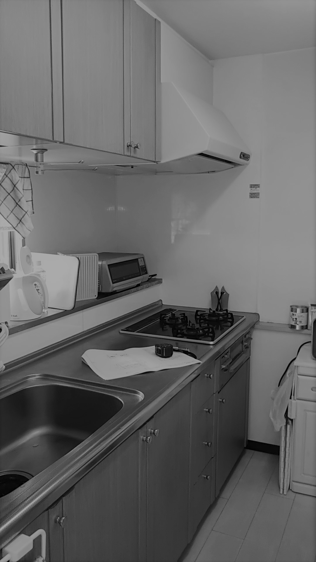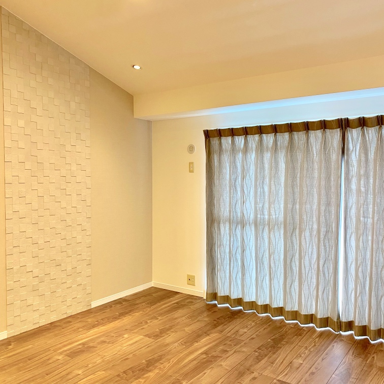 壁紙やドア、カーテンをグレーやベージュでトータルコーディネートしました。